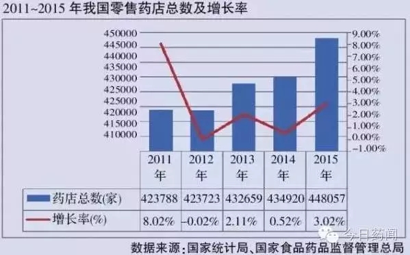 藥店總數(shù):448057家,同比增長3.02% 截至2015年底,我國的藥店總數(shù)(包括連鎖門店和單體藥店)為448057家,同比增長3.02%。 在GDP持續(xù)增長、社會(huì)消費(fèi)水平提高、人口老齡化、城鎮(zhèn)化以及消費(fèi)結(jié)構(gòu)升級(jí)等因素的驅(qū)動(dòng)下,我國醫(yī)藥零售市場(chǎng)仍存在較大發(fā)展空間。