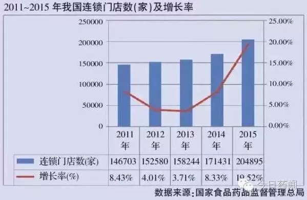 連鎖藥店:藥品連鎖企業(yè)4981家,連鎖門店204895家 2015年,我國藥品連鎖企業(yè)為4981家,同比增長16.76%,連鎖門店數(shù)為204895家,增長19.52%,增長率創(chuàng)近年新高。 連鎖企業(yè)數(shù)量增長有所放緩,但連鎖門店數(shù)量銳增,表明連鎖藥店的集中度不斷上升,在政策的導(dǎo)向和資本運(yùn)作的推動(dòng)下,藥品零售市場(chǎng)呈現(xiàn)“強(qiáng)者恒強(qiáng),弱者愈弱”的格局。