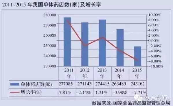 據(jù)《2016年度中國醫(yī)藥市場(chǎng)發(fā)展藍(lán)皮書》顯示,2015年,我國藥店總數(shù)繼續(xù)上升,同比增幅有所上揚(yáng),但平均每店服務(wù)人數(shù)持續(xù)下滑。截至2015年底,我國單體藥店數(shù)量銳減至243162家,下跌7.71%,出現(xiàn)近九年來最大跌幅。