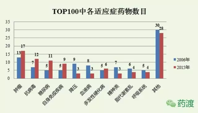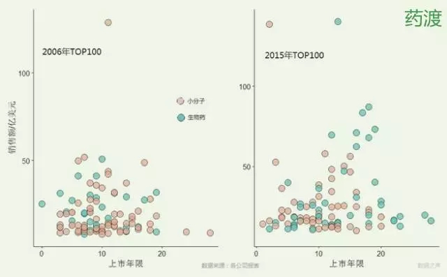 這是顯而易見的,不只是如今貨幣的購買能力不能與10年前同日耳語,這些藥物的“科技含量”和凝結(jié)的“一般勞動時(shí)間”肯定也與日俱增,2006年TOP100的門檻約為為8億美元,平均年銷售額為20億美元,到了2015年門檻已經(jīng)超過了10億美元,而平均銷售額超過了28億美元。中位數(shù)也從14.7億美元上升到19億美元。