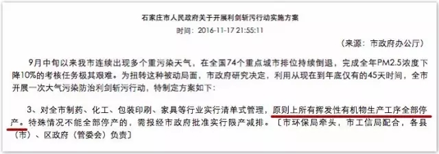 11月17日,石家莊市人民政府下發(fā)《關(guān)于開展利劍斬污行動實施方案》,文件要求從2016年11月17日到2016年12月31日,關(guān)停大批重污染企業(yè),對制藥企業(yè)實行清單式管理,原則上所有揮發(fā)性有機物生產(chǎn)工序全部停產(chǎn),特殊情況不能全部停產(chǎn)的,需報經(jīng)市政府批準實行限產(chǎn)減排。
