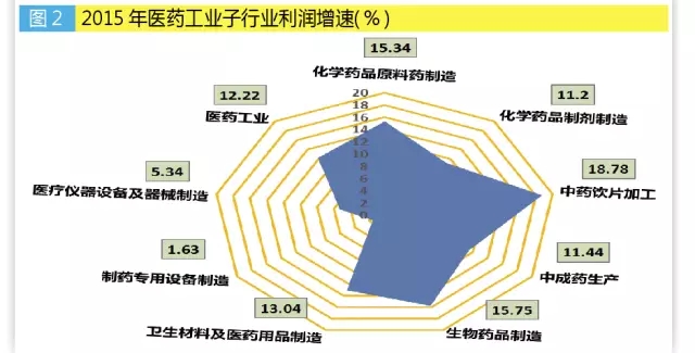 2015年,醫(yī)藥工業(yè)規(guī)模以上企業(yè)實(shí)現(xiàn)利潤(rùn)總額2768.23億元,同比增長(zhǎng)12.22%,高于全國(guó)工業(yè)增速14.52個(gè)百分點(diǎn),較上年下降0.93個(gè)百分點(diǎn)。其中中藥飲片加工行業(yè)全年利潤(rùn)增速高于8類(lèi)子行業(yè)利潤(rùn)增速。