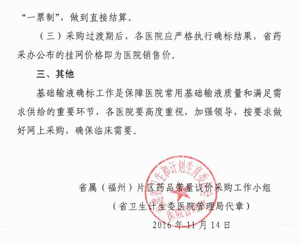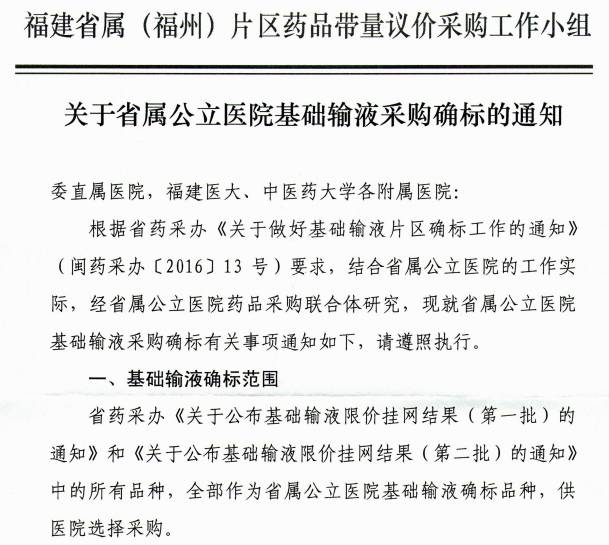 近日,有業(yè)內人士向賽柏藍反映,一份福建省衛(wèi)計委醫(yī)院管理局戳紅章,名為《關于省屬公立醫(yī)院基礎輸液確標的通知》的內部文件,直接下發(fā)到醫(yī)院,文件明確要求醫(yī)院根據第一、二批基礎輸液限價掛網結果進行選擇采購,醫(yī)院和藥品生產企業(yè)直接結算,嚴格執(zhí)行“一票制”。
