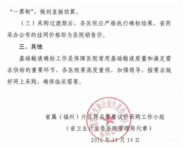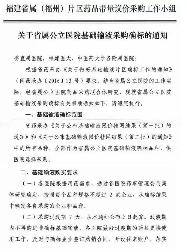 近日,有業(yè)內(nèi)人士向賽柏藍(lán)反映,一份福建省衛(wèi)計(jì)委醫(yī)院管理局戳紅章,名為《關(guān)于省屬公立醫(yī)院基礎(chǔ)輸液確標(biāo)的通知》的內(nèi)部文件,直接下發(fā)到醫(yī)院,文件明確要求醫(yī)院根據(jù)第一、二批基礎(chǔ)輸液限價(jià)掛網(wǎng)結(jié)果進(jìn)行選擇采購,醫(yī)院和藥品生產(chǎn)企業(yè)直接結(jié)算,嚴(yán)格執(zhí)行“一票制”。