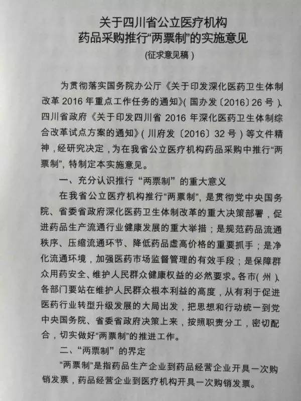 今天中午,醫(yī)藥云端工作室的CSO部落收到群友提供的一組圖片,圖片上顯示的是關于“四川兩票制的實施意見(征求意見稿)” (以下簡稱實施意見),落款單位為四川省醫(yī)改辦,時間為11月24日。