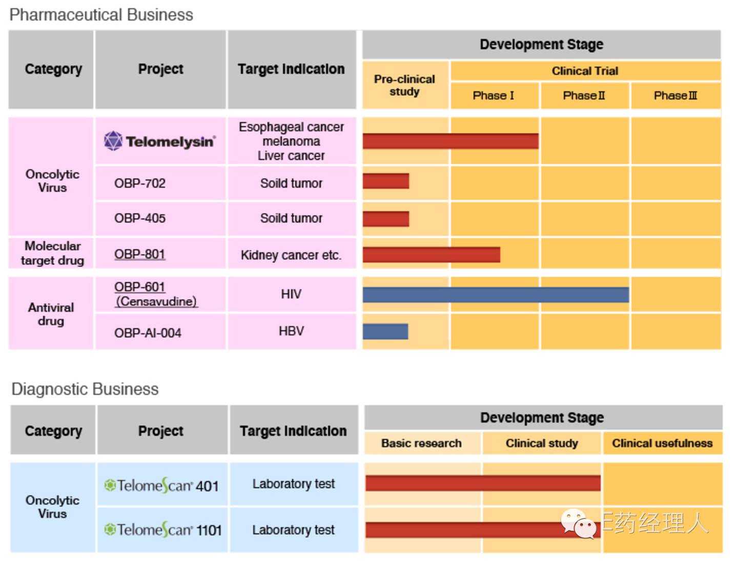 Oncolys是日本東京證交所創(chuàng)業(yè)板上市的一家生物制藥公司,關注腫瘤和感染病領域的創(chuàng)新生物藥的開發(fā)。業(yè)務包括腫瘤和腫瘤診斷兩部分,其中,腫瘤治療業(yè)務產品線包括溶瘤腺病毒產品組合、腎癌藥物、艾滋病和乙肝藥物。公司在研的主打產品Telomelysin(OBP-301)是基于增殖性的溶瘤病毒,已經在亞洲多個國家和地區(qū)進行了多項實體瘤的臨床I/II期試驗,適應證包括食道癌、黑色素瘤和肝癌。