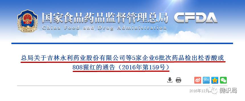 昨天,國家食品藥品監(jiān)督管理總局發(fā)布公告,吉林永利藥業(yè)股份有限公司等5家企業(yè)生產的6批次藥品被檢出非法添加松香酸、808猩紅等物質,問題藥品現(xiàn)已被查封扣押、暫停銷售及召回。