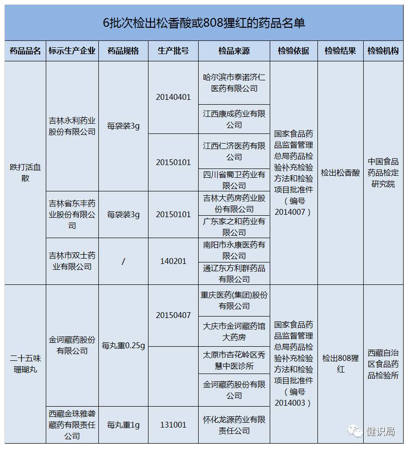 《通告》中稱,吉林永利藥業(yè)股份有限公司生產的批號分別為20140404和20150101、吉林省東豐藥業(yè)股份有限公司生產的批號為20150101、吉林市雙士藥業(yè)有限公司生產的批號為140201的跌打活血散檢出松香酸。
