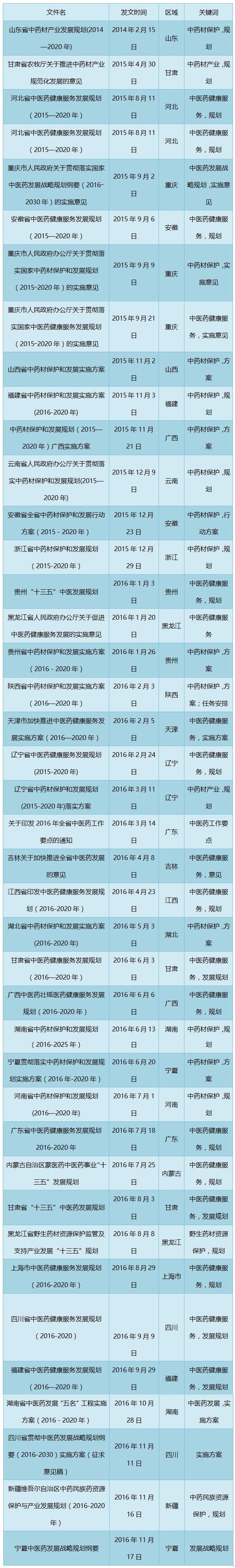 自2013年3月25日國家中醫(yī)藥管理局發(fā)布《中醫(yī)預防保健(治未病)服務科技創(chuàng)新綱要(2013-2020年)》以來,至12月3日中醫(yī)藥管理局發(fā)布的我國首個中醫(yī)藥信息化發(fā)展的《中醫(yī)藥信息化發(fā)展“十三五”規(guī)劃》,以及前日關于我國中醫(yī)藥發(fā)展首份白皮書《<中國的中醫(yī)藥>白皮書》,我國中央部委和各省區(qū)市陸續(xù)發(fā)布的中醫(yī)藥行業(yè)發(fā)展的扶持文件多達50份。