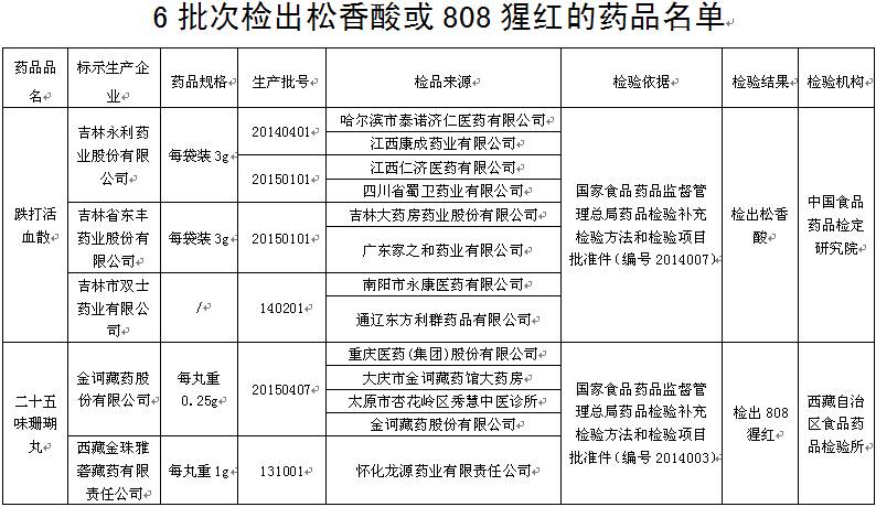 一、經(jīng)中國食品藥品檢定研究院檢驗,發(fā)現(xiàn)標示為吉林永利藥業(yè)股份有限公司生產(chǎn)的批號分別為20140404和20150101、吉林省東豐藥業(yè)股份有限公司生產(chǎn)的批號為20150101、吉林市雙士藥業(yè)有限公司生產(chǎn)的批號為140201的跌打活血散檢出松香酸。