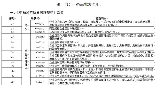 三、本指導(dǎo)原則檢查項(xiàng)目分三部分。批發(fā)企業(yè)檢查項(xiàng)目共256項(xiàng),其中嚴(yán)重缺陷項(xiàng)目(**)10項(xiàng),主要缺陷項(xiàng)目(*)103項(xiàng),一般缺陷項(xiàng)目143項(xiàng);零售企業(yè)檢查項(xiàng)目共176項(xiàng),其中嚴(yán)重缺陷項(xiàng)目(**)8項(xiàng),主要缺陷項(xiàng)(*)53項(xiàng),一般缺陷項(xiàng)115項(xiàng);體外診斷試劑(藥品)經(jīng)營企業(yè)檢查項(xiàng)目共185項(xiàng),其中嚴(yán)重缺陷項(xiàng)目(**)9項(xiàng),主要缺陷項(xiàng)(*)70項(xiàng),一般缺陷項(xiàng)106項(xiàng)。