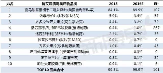 據中康CMH監(jiān)測數據顯示,在2015年我國抗艾滋病毒類藥物市場中,前十品牌已占據九成的市場份額,集中度較高。其中美國吉利德、默沙東和葛蘭素史克這3大制藥企業(yè)幾乎壟斷了抗艾滋病藥物市場。由美國吉利德研發(fā)生產的富馬酸替諾福韋二吡呋酯片和恩曲他濱替諾福韋片,有著臨床療效顯著、耐藥性及副作用較少的優(yōu)勢,以84.1%的市場份額穩(wěn)居榜首,預測2016年的份額達89.9%。