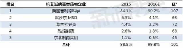 據中康CMH監(jiān)測數據顯示,2015年我國抗艾滋病毒類藥物以外資企業(yè)為主,美國吉利德、默沙東、葛蘭素史克和雅培等外資企業(yè)為主導,其中美國吉利德一直在艾滋病藥物市場居統治地位,而內資企業(yè)僅有東北制藥擠進前五。