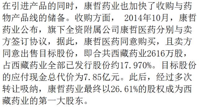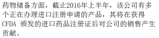 此外,還有從丹麥H.Lundbeck A/S引進(jìn)的治療輕度至中度抑郁和焦慮的藥物黛力新(氟哌噻噸和美利曲辛),從德國Dr. Falk Pharma GmbH拿到的治療膽囊膽固醇結(jié)石、膽汁淤積性肝病及膽汁反流性胃炎的藥物優(yōu)思弗(熊脫氧膽酸),從持股26.61% 的西藏藥業(yè)之子公司引進(jìn)的新活素(奈西立肽、凍干重組人腦利鈉肽),從德國 Dr. Falk Pharma GmbH取得的莎爾福(美色拉秦)等,2016年上半年分別實(shí)現(xiàn)銷售4.70億、3.54億、2.57億、1.01億;較去年同期分別增長4.3%、11.3%、17.6%、17.3%。