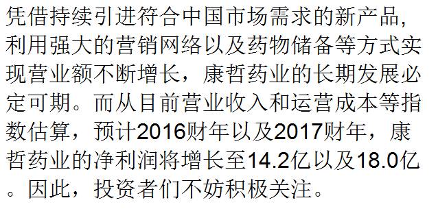 財(cái)報(bào)顯示,2015財(cái)年,康哲藥業(yè)錄得銷售收入人民幣35.53億(單位同下)(2014年:29.45億),同比增長20.7%。2016年上半年,該公司錄得銷售收入21.77億(2015年同期:16.76億),同比增長29.9%;期間溢利6.54億(2015年同期:4.93億),同比增長32.5%;每股基本盈利增長29.9%至0.26元(2015年中期:0.20元)。