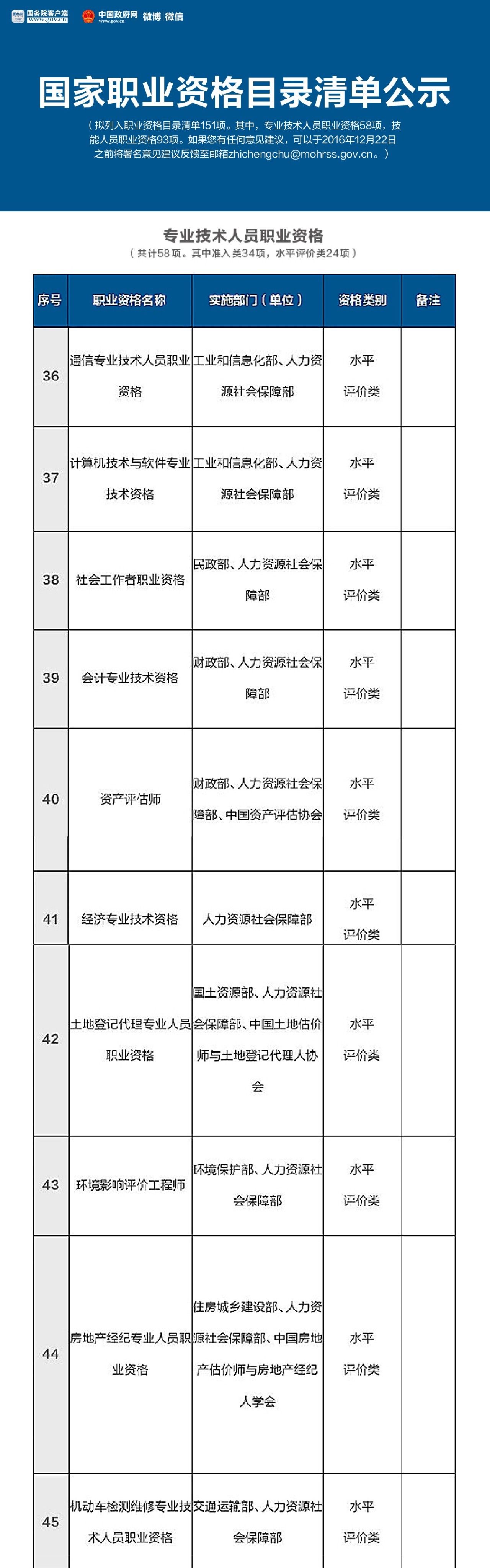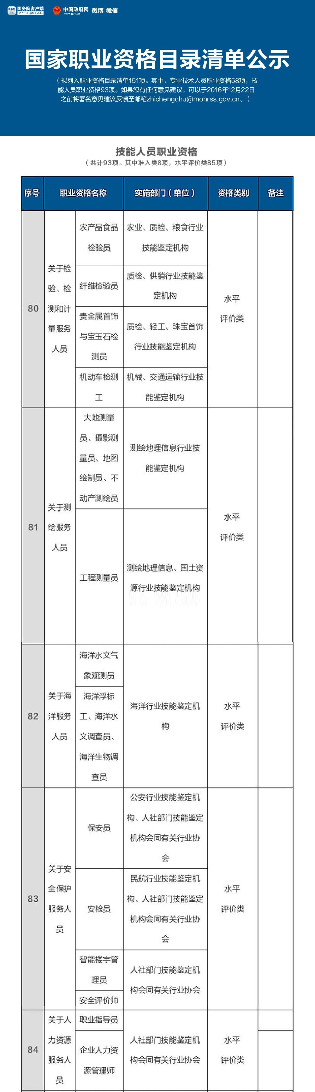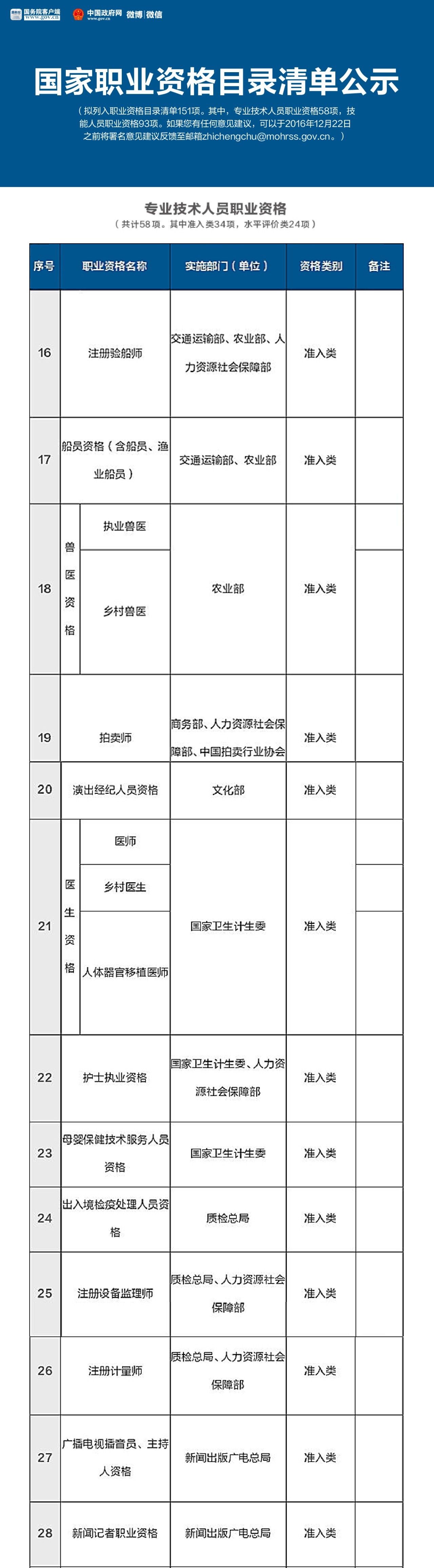 就在這個月的16號,人力資源和社會保障部公示了國家職業(yè)資格目錄清單,擬列入職業(yè)資格目錄清單151項。其中,專業(yè)技術(shù)人員職業(yè)資格58項,技能人員職業(yè)資格93項。