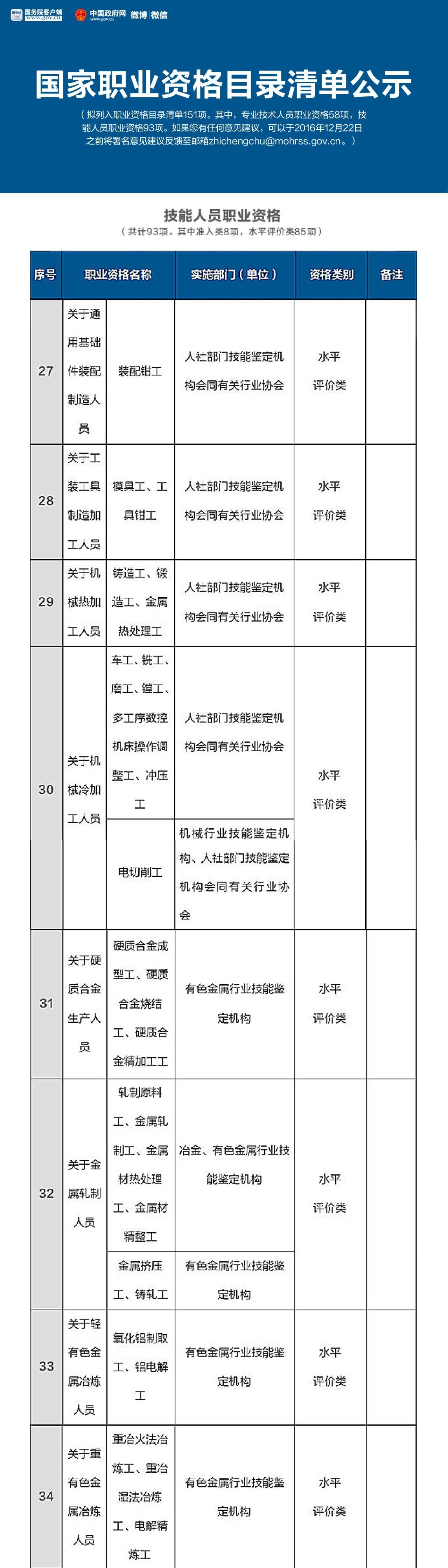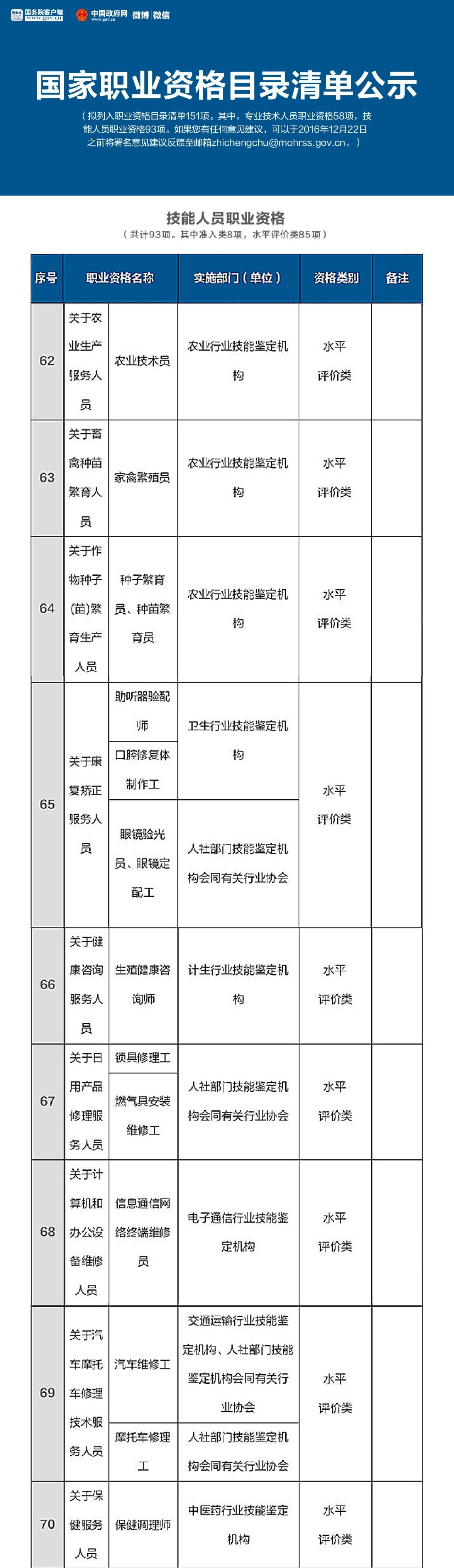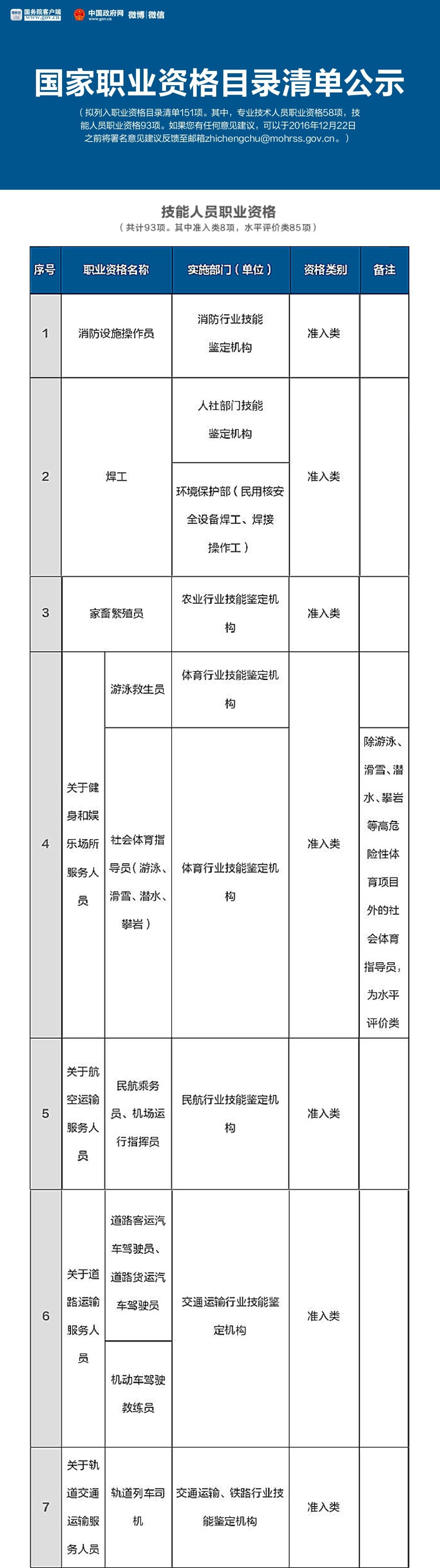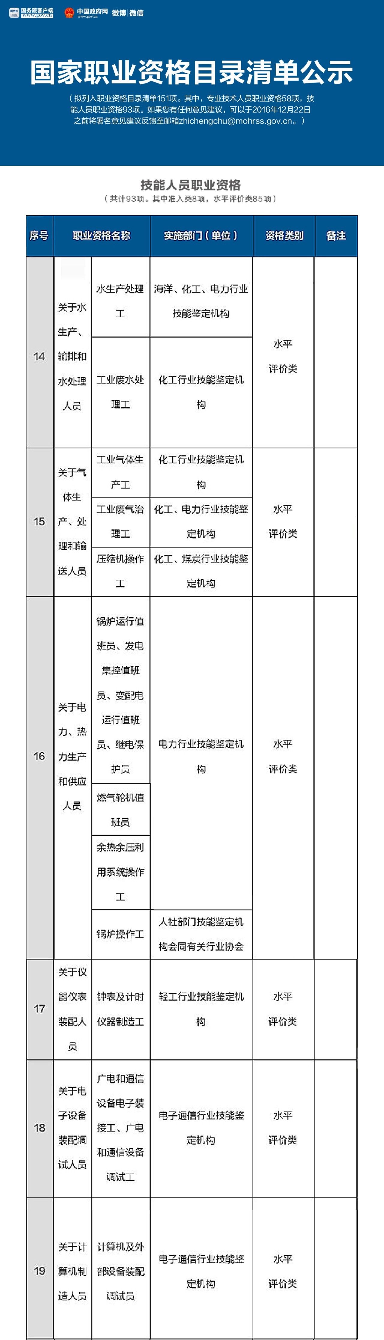 就在這個月的16號,人力資源和社會保障部公示了國家職業(yè)資格目錄清單,擬列入職業(yè)資格目錄清單151項。其中,專業(yè)技術(shù)人員職業(yè)資格58項,技能人員職業(yè)資格93項。