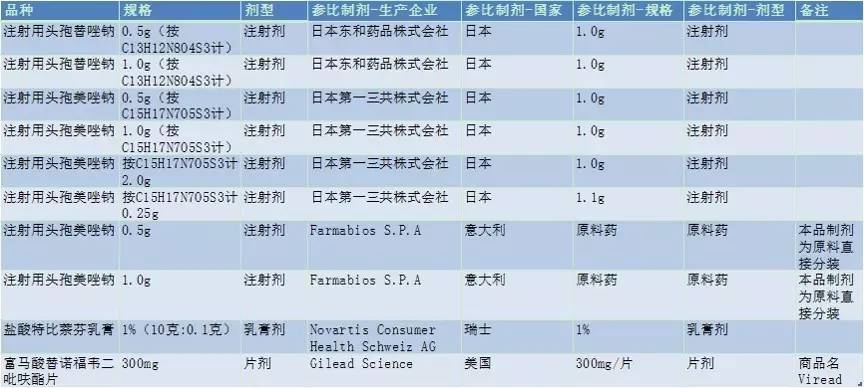 鹽酸特比萘芬乳膏,參比制劑生產(chǎn)企業(yè)Novartis Consumer Health Schweiz AG,規(guī)格1%,乳膏劑。富馬酸替諾福韋二吡呋酯片,參比制劑生產(chǎn)企業(yè)Gilead Science,300mg/片。