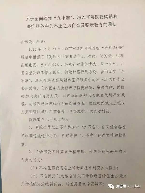 衛(wèi)生廳:[杭州各醫(yī)院]各位主任:2016年12月24日,央視新聞頻道在“新聞30分”欄目中播出《高回扣下的高藥價》報道,近期本地媒體亦有可能隨時暗訪,請各位主任高度重視,通知科內(nèi)所有醫(yī)生嚴(yán)禁在診間、病房等醫(yī)療區(qū)域接待醫(yī)藥代表,一旦發(fā)現(xiàn)查實將嚴(yán)肅處理。