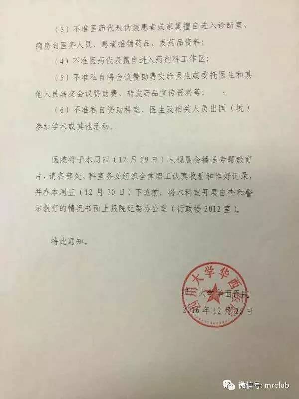 四川華西醫(yī)院通知,規(guī)范了6點和醫(yī)藥代表交往的行為: