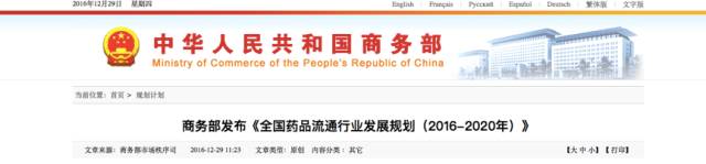 商務(wù)部官網(wǎng)昨日(12月29日)發(fā)布《全國藥品流通行業(yè)發(fā)展規(guī)劃(2016-2020年)》(以下簡稱《規(guī)劃》),“現(xiàn)代藥品流通體系”、“兼并重組”、“轉(zhuǎn)型升級”、“互聯(lián)網(wǎng)+”、“大健康”,以及“適應(yīng)‘兩票制’改革”等關(guān)鍵詞和信息頻繁跳出。