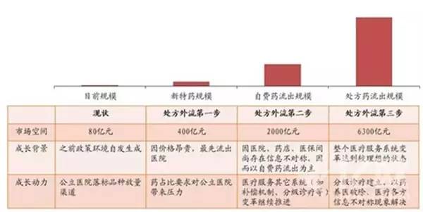 第二階段(自費(fèi)藥流出階段):隨著醫(yī)療服務(wù)其它系統(tǒng)的變革推進(jìn),以藥養(yǎng)醫(yī)局面逐步破除,醫(yī)藥分家將繼續(xù)發(fā)酵,然而,由于醫(yī)院、藥房、醫(yī)保之間的信息不對(duì)稱,外流藥品以自費(fèi)藥為主。根據(jù)草根調(diào)研,此前國(guó)內(nèi)典型的三級(jí)綜合醫(yī)院(友誼、華山、浙醫(yī)、中山醫(yī)等)自費(fèi)藥占比在30-40%之間,三級(jí)專科醫(yī)院(阜外、腫瘤醫(yī)院等)自費(fèi)藥占比在40-50%左右,二級(jí)醫(yī)院在20%以下,我們保守估計(jì)國(guó)內(nèi)自費(fèi)藥占醫(yī)院藥品市場(chǎng)的比例約20%,則醫(yī)院市場(chǎng)流出的自費(fèi)藥市場(chǎng)規(guī)模約2000億元。