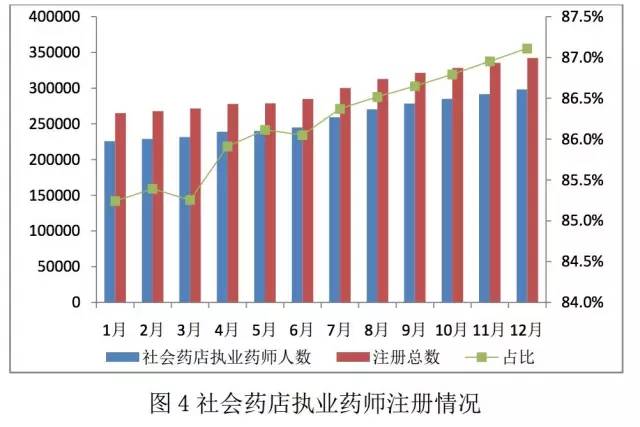 截至2016年12月31日,注冊于社會藥店的執(zhí)業(yè)藥師298016人,占注冊總數(shù)的87.1%,環(huán)比增加6412人。
