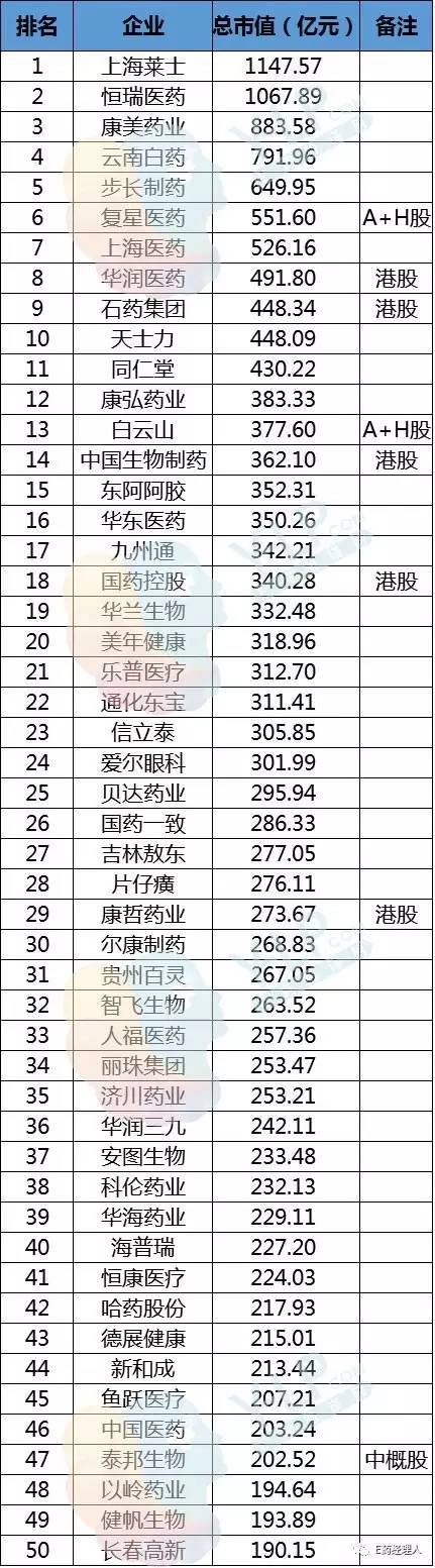 【309家】2016年國內藥企市值TOP50,你的東家排第幾?