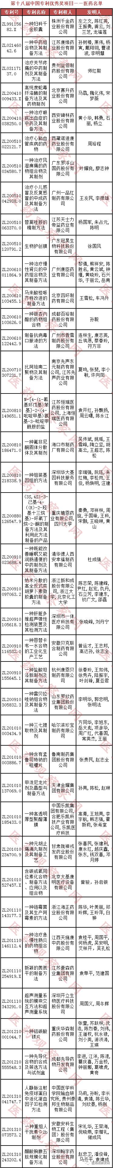 株洲千金藥業(yè)的“一種婦科千金膠囊”、江蘇康緣藥業(yè)的“一種中藥組合物及其制備方法”、貴州益佰制藥的“治療關(guān)節(jié)疼痛的中藥制劑及其制備方法”等41個(gè)醫(yī)藥項(xiàng)目獲得第十八屆中國(guó)專(zhuān)利優(yōu)秀獎(jiǎng)。