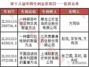 其中黑龍江珍寶島藥業(yè)的“一種銀杏葉組合物及其制備方法”、江蘇奧賽康藥業(yè)的“一種雷貝拉唑鈉的制備方法”、海聯(lián)影醫(yī)療科技的“平面回波成像序列圖像的重建方法”3個(gè)醫(yī)藥項(xiàng)目獲得第十八屆中國(guó)專(zhuān)利金獎(jiǎng);