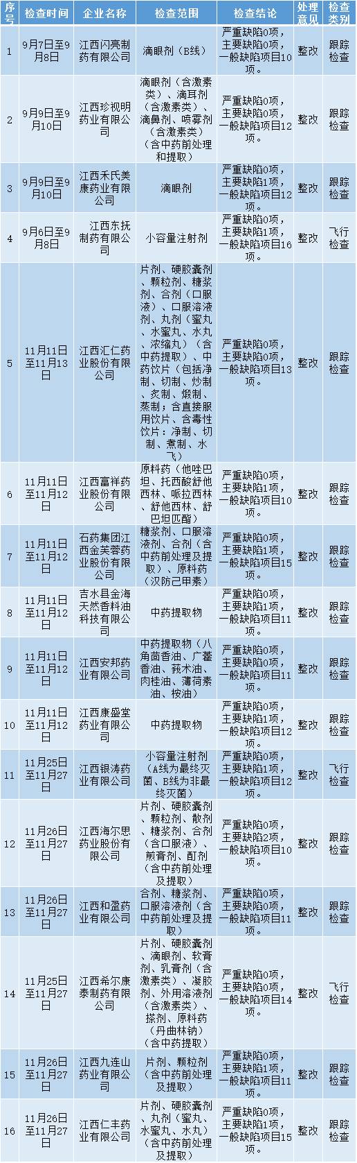 根據(jù)江西省食藥監(jiān)局2016年度藥品生產(chǎn)監(jiān)督檢查計(jì)劃,2016年9至12月,省局組織檢查組對(duì)江西東撫制藥有限公司、江西銀濤藥業(yè)有限公司、江西希爾康泰制藥有限公司進(jìn)行了飛行檢查,對(duì)江西閃亮制藥有限公司、江西珍視明藥業(yè)有限公司等13家藥品生產(chǎn)企業(yè)進(jìn)行了跟蹤檢查,現(xiàn)將檢查發(fā)現(xiàn)均存在主要缺陷或一般缺陷。