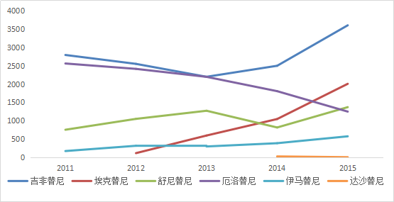 圖4 上海樣本醫(yī)院蛋白激酶抑制劑類抗腫瘤藥市場趨勢(2011-2015)