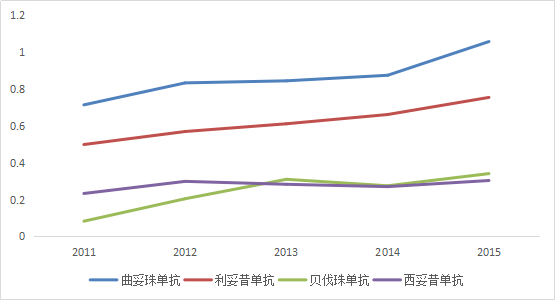 圖2 上海樣本醫(yī)院單克隆抗體類抗腫瘤藥市場趨勢(2011-2015)