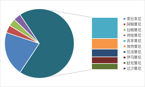 圖3 上海樣本醫(yī)院蛋白激酶抑制劑類抗腫瘤藥市場分布(2016Q1-2016Q3)