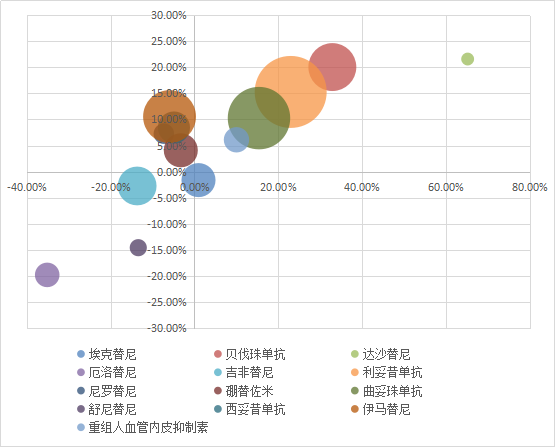 基于PDB國內(nèi)樣本醫(yī)院市場數(shù)據(jù),針對上述目錄中的抗腫瘤藥(共13個通用名),以2016Q3數(shù)據(jù)為基礎(chǔ),統(tǒng)計每個通用名的同比和環(huán)比成長。相較于2016Q3整體市場的同比/環(huán)比數(shù)據(jù),第一象限內(nèi)的單抗表現(xiàn)搶眼(貝伐珠單抗、利妥昔單抗、曲妥珠單抗),在保有一定市場規(guī)模的同時,成長性非常高;與此同時,激酶抑制劑的表現(xiàn)不盡如人意,相較于上海市場,全國市場有4個品種落在第四象限,只有1個規(guī)模很小的品種處于第一象限,但對整體市場幾乎不產(chǎn)生影響,表現(xiàn)最低迷的仍是厄洛替尼。