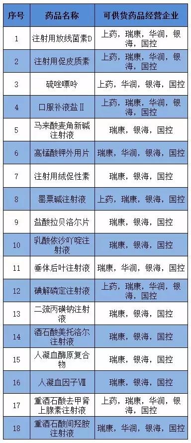 同時(shí),山東省衛(wèi)計(jì)委經(jīng)與幾家大型藥品經(jīng)營企業(yè)溝通,也公布了此次短缺藥品的貨源信息。據(jù)統(tǒng)計(jì),18個(gè)短缺藥品的貨源,分屬與瑞康醫(yī)藥股份有限公司、華潤山東醫(yī)藥有限公司、山東上藥醫(yī)藥有限公司、濟(jì)南銀海醫(yī)藥有限公司(山東海王)、國藥控股山東有限公司這5家企業(yè)。(如下圖)