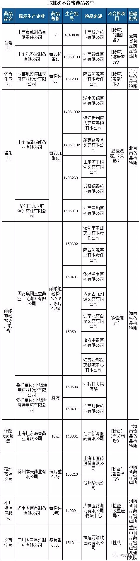 山西康威制藥有限責(zé)任公司和山東孔圣堂制藥有限公司生產(chǎn)的批號分別為4140303和15050100的白帶丸,成都地奧集團天府藥業(yè)股份有限公司生產(chǎn)的批號為151208的沉香化氣丸,山東臨清華威藥業(yè)有限公司和華潤三九(臨清)藥業(yè)有限公司生產(chǎn)的批號分別為14031902、14061702、14082301和15050101的磁朱丸,國藥集團三益藥業(yè)(蕪湖)有限公司和上海通用藥業(yè)股份有限公司委托上海世康特制藥有限公司生產(chǎn)的批號分別為160302、160401、160501和150503、150401的醋酸氟輕松冰片乳膏,上海旭東海普藥業(yè)有限公司生產(chǎn)的批號為140301的輔酶Q10膠囊,錦州本天藥業(yè)有限公司生產(chǎn)的批號為150213的蒲地藍消炎片,河南省百泉制藥有限公司生產(chǎn)的批號為140201的小兒瀉速停顆粒,四川省三星堆制藥有限公司生產(chǎn)的批號為151211的炎可寧片。