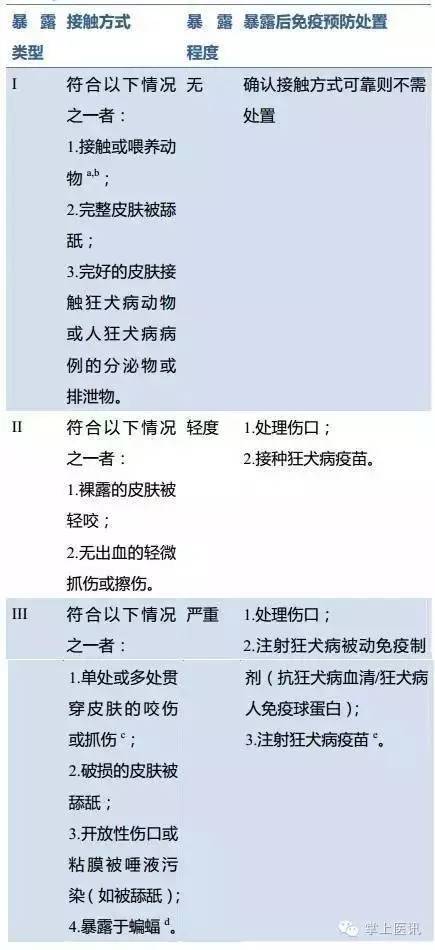 按照暴露性質(zhì)和嚴(yán)重程度將狂犬病暴露分為三級: