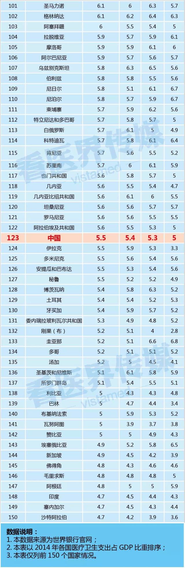 數(shù)讀1、和世界銀行公布的數(shù)據(jù)相比,中國(guó)官方公布的2013年中國(guó)醫(yī)療衛(wèi)生投入占GDP數(shù)據(jù)為 5.57%,差了0.07%,可能是未及時(shí)更新,或省略了末尾數(shù)字。不過(guò)即使加上0.07個(gè)百分點(diǎn),也不影響中國(guó)的排名。 2、中國(guó)醫(yī)療衛(wèi)生投入占GDP比重在榜單上的150個(gè)國(guó)家和地區(qū)中排名第123位,系倒數(shù)第28位。不及美國(guó)的零頭,也不到歐洲大國(guó)的一半。可見(jiàn)如果政府想在醫(yī)療衛(wèi)生上加大投入,想在花錢(qián)上趕超歐美,還有很長(zhǎng)的路要走,還要投入更多的錢(qián)。有醫(yī)生評(píng)價(jià):為什么我們看病很多需要自費(fèi)?圖表說(shuō)明了一切。所以近幾年醫(yī)改怨聲載道,這也是其中原因之一…… 3、醫(yī)改是不是簡(jiǎn)單地投錢(qián)呢?在該排名中,小編看到了名列第144位的新加坡。這個(gè)花了很少錢(qián)卻取得了巨大醫(yī)療衛(wèi)生成就的國(guó)家,也很值得我們深思。有網(wǎng)友表示:由于國(guó)內(nèi)的醫(yī)改未曾動(dòng)及體制,所以即便是近年來(lái)政府加大了投入,卻不知道錢(qián)都去哪兒了,百姓、醫(yī)護(hù)感受到的改革效果也并不明顯??梢?jiàn)加大衛(wèi)生投入和改革醫(yī)療衛(wèi)生體制兩手都要抓。 4、在榜單上的150個(gè)國(guó)家和地區(qū)中,醫(yī)療服務(wù)供給主要靠公立醫(yī)療機(jī)構(gòu)的國(guó)家可謂非常非常罕見(jiàn),中國(guó)卻是其中之一。 5、花很少的錢(qián),卻辦很多的公立醫(yī)院,又能夠維持良性運(yùn)轉(zhuǎn)的醫(yī)療衛(wèi)生體制,在榜單上150個(gè)國(guó)家中沒(méi)有看到,小編也沒(méi)有聽(tīng)說(shuō)過(guò)。