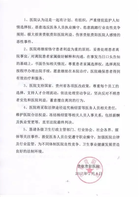 對于貴航貴陽醫(yī)院聲明中楊紹雷私自帶患者離院一事,楊紹雷回應說,1月30日,自己通過醫(yī)院的系統(tǒng)給患者都開具了出院證明、醫(yī)囑等出院必須的手續(xù),院方在系統(tǒng)后臺撤銷了這些手續(xù),并凍結了自己的賬號。楊紹雷還表示,在轉院之前,他和患者家屬取得過聯(lián)系,在家屬的同意下才將患者帶離貴航貴陽醫(yī)院。