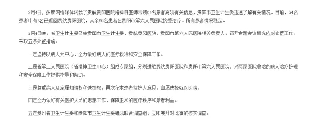 對此,貴陽市衛(wèi)計委于2月5日晨通過其官網(wǎng)刊載了對事件的詳細回應。回應中稱,“目前64名患者中有4名已返回貴航貴陽醫(yī)院,其余60名患者在貴陽市第六人民醫(yī)院接受治療。所有患者情況穩(wěn)定。”