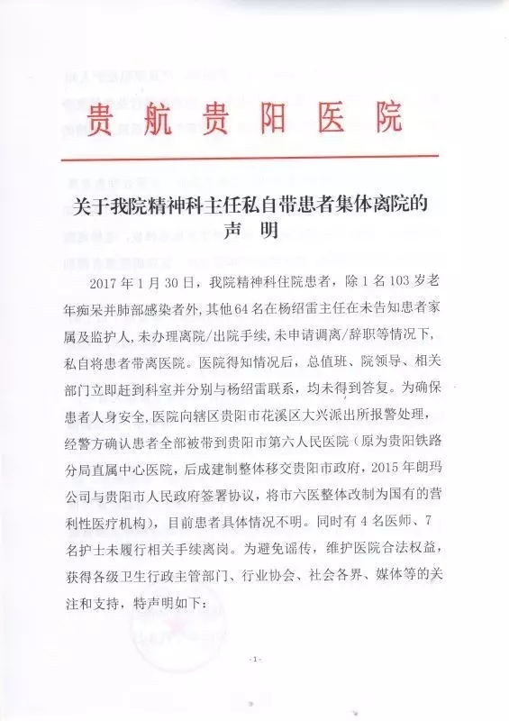 2月4日,貴陽市貴航貴陽醫(yī)院在其官網(wǎng)發(fā)布《關于我院精神科主任私自帶患者集體離院的聲明》。消息一出,引發(fā)各方關注。聲明如下:
