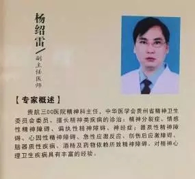 楊紹雷在醫(yī)院網(wǎng)頁中的簡介顯示,他畢業(yè)于貴陽醫(yī)學院臨床醫(yī)學系。擅長精神科疾病的診療,對精神分裂癥、情感性精神障礙、神經(jīng)癥、癔癥、應激相關障礙;腦器質(zhì)性疾病、軀體疾病、酒精依賴、藥物依賴所致精神障礙等有豐富的診治經(jīng)驗。