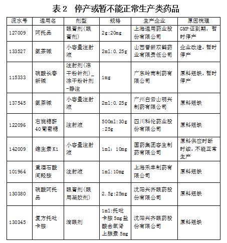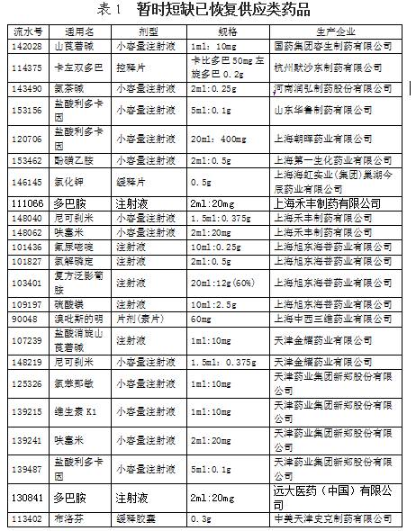 由于企業(yè)生產(chǎn)線改造、原料暫時短缺、易凍產(chǎn)品溫度過低結(jié)晶、產(chǎn)品召回等原因造成藥品暫時性短缺,現(xiàn)已恢復(fù)正常供應(yīng)(詳見表1)。