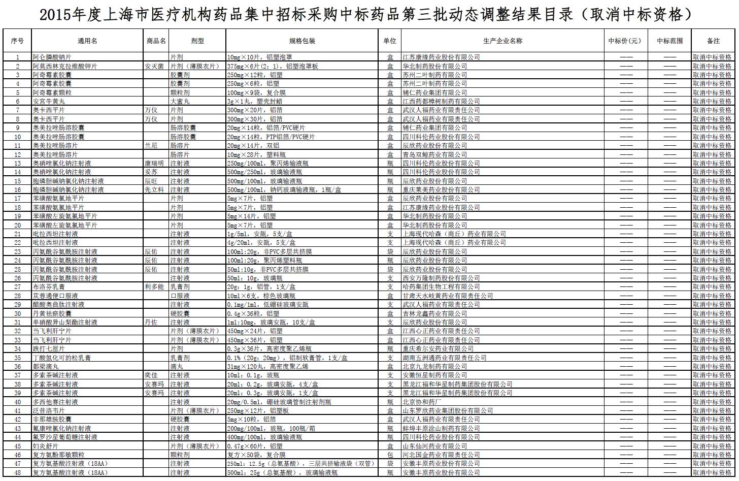 2、2015年度上海市醫(yī)療機(jī)構(gòu)藥品集中招標(biāo)采購中標(biāo)藥品第三批動(dòng)態(tài)調(diào)整結(jié)果目錄(取消中標(biāo)資格,共397個(gè)藥品)