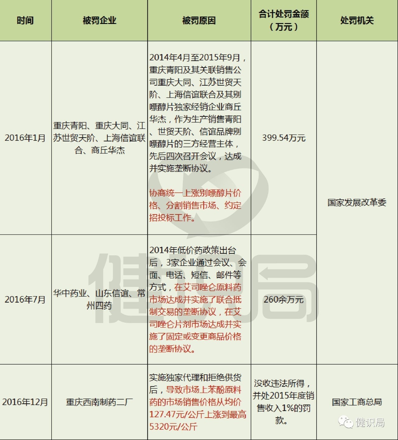 2016年,國家發(fā)展改革委,對重慶青陽、重慶大同、江蘇世貿(mào)天階、上海信誼聯(lián)合、商丘華杰等5家公司達成并實施低價藥別嘌醇片壟斷協(xié)議案依法作出處罰,合計罰款399.54萬元。