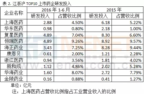 研發(fā)投入在醫(yī)藥行業(yè)中是衡量企業(yè)未來發(fā)展的一個重要指標(biāo),近年,國家政策大力支持研發(fā)創(chuàng)新,醫(yī)藥企業(yè)的研發(fā)水平有所提升。數(shù)據(jù)顯示,2016年1-6月復(fù)星醫(yī)藥、恒瑞醫(yī)藥研發(fā)投入均近5億元;2015年,復(fù)星醫(yī)藥、恒瑞醫(yī)藥和海正藥業(yè)研發(fā)投入均超8億元,所占營收比例在行業(yè)中名列前茅。