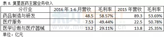 2015年,復(fù)星醫(yī)藥營收126.09億元,同比增長4.85%,歸屬于上市公司股東的凈利潤 24.60 億元,同比增長16.43%。其中,藥品制造與研發(fā)實現(xiàn)營業(yè)收入89.35億元,同比增長21.78%;醫(yī)療服務(wù)實現(xiàn)營業(yè)收入13.79億元,同比增長16.26%。營業(yè)收入增長是因為制造業(yè)務(wù)、醫(yī)療服務(wù)業(yè)務(wù)和器械代理業(yè)務(wù)的收入增長。