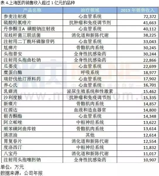 2015年,上海醫(yī)藥60個重點品種銷售收入67.90億元,同比增長12.52%,銷售占工業(yè)比重57.43%,重點品種毛利率67.04%。收入超過1億元產(chǎn)品達到24個,在前五品種里,心血管系統(tǒng)占了3個,參麥注射液更以7.24億元銷售額獨占鰲頭。據(jù)資料顯示,上海醫(yī)藥預(yù)計2016年銷售收入超過1億元的大品種有25個。