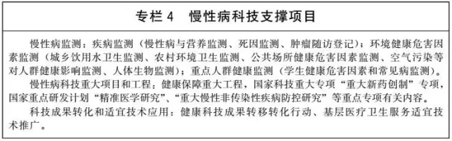 2.推動科技成果轉(zhuǎn)化和適宜技術(shù)應用。系統(tǒng)加強慢性病防治科研布局,推進相關科研項目。進一步加強國家臨床醫(yī)學研究中心和協(xié)同創(chuàng)新網(wǎng)絡建設,完善重大慢性病研究體系。以信息、生物和醫(yī)學科技融合發(fā)展為引領,加強慢性病防治基礎研究、應用研究和轉(zhuǎn)化醫(yī)學研究。統(tǒng)籌優(yōu)勢力量,推進慢性病致病因素、發(fā)病機制、預防干預、診療康復、醫(yī)療器械、新型疫苗和創(chuàng)新藥物等研究,重點突破精準醫(yī)療、“互聯(lián)網(wǎng)+”健康醫(yī)療、大數(shù)據(jù)等應用的關鍵技術(shù),支持基因檢測等新技術(shù)、新產(chǎn)品在慢性病防治領域推廣應用。針對中醫(yī)藥具有優(yōu)勢的慢性病病種,總結(jié)形成慢性病中醫(yī)健康干預方案并推廣應用。結(jié)合慢性病防治需求,遴選成熟有效的慢性病預防、診療、康復保健適宜技術(shù),加快成果轉(zhuǎn)化和應用推廣。開展慢性病社會決定因素與疾病負擔研究,探索有效的慢性病防控路徑。在專業(yè)人才培養(yǎng)培訓、信息溝通及共享、防治技術(shù)交流與合作、能力建設等方面積極參與國際慢性病防治交流與合作。